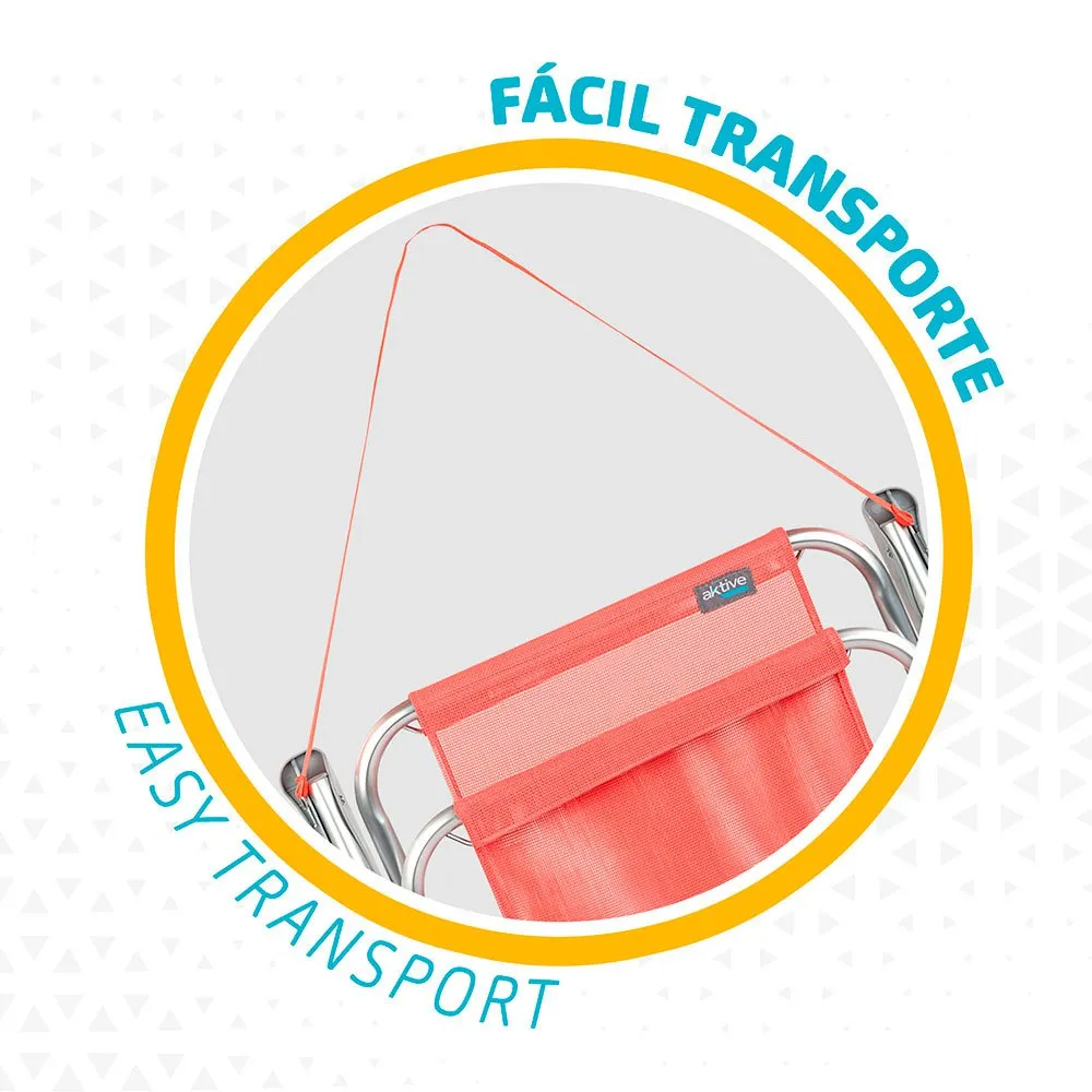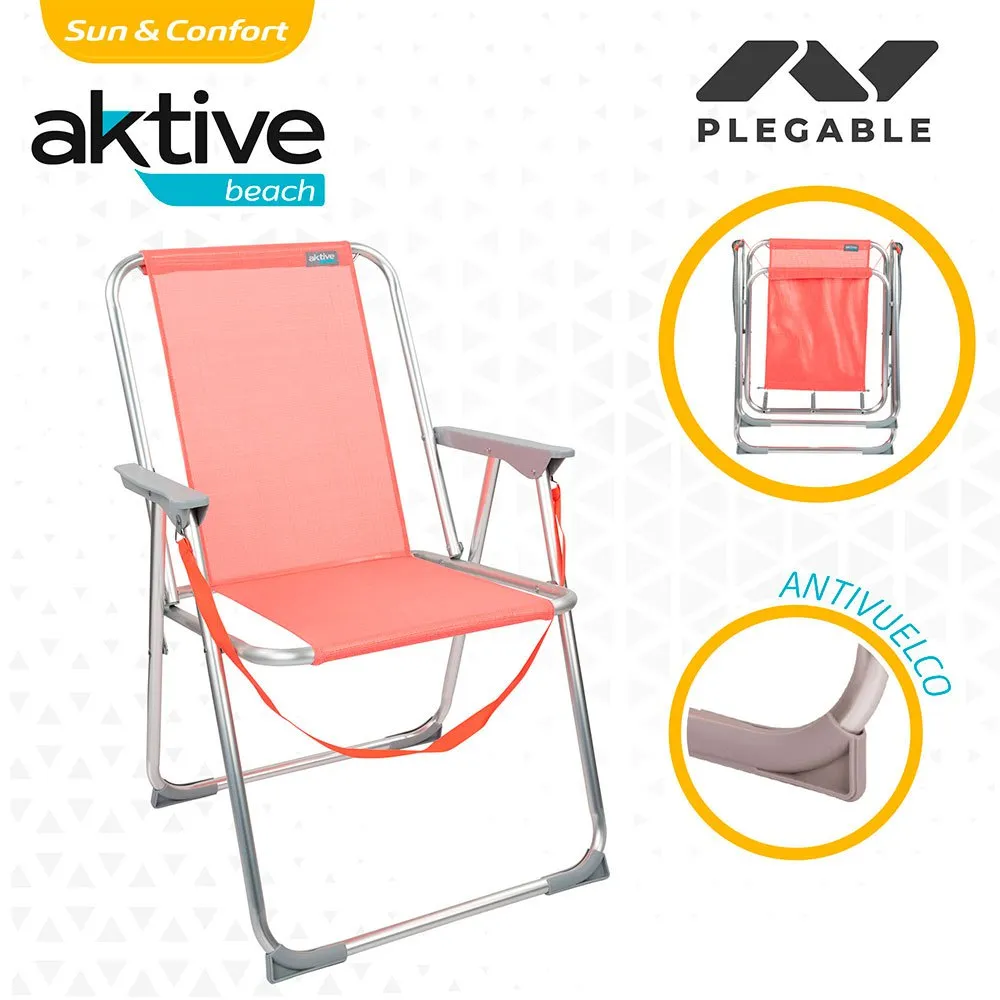 Aktive Beach high chair with fixed position folding in coral color and measures 53x44x76 cm, made with a resistant aluminum structure and a waterproof, washable and weather resistant textilene seat, supports a maximum weight of 100 Kg.