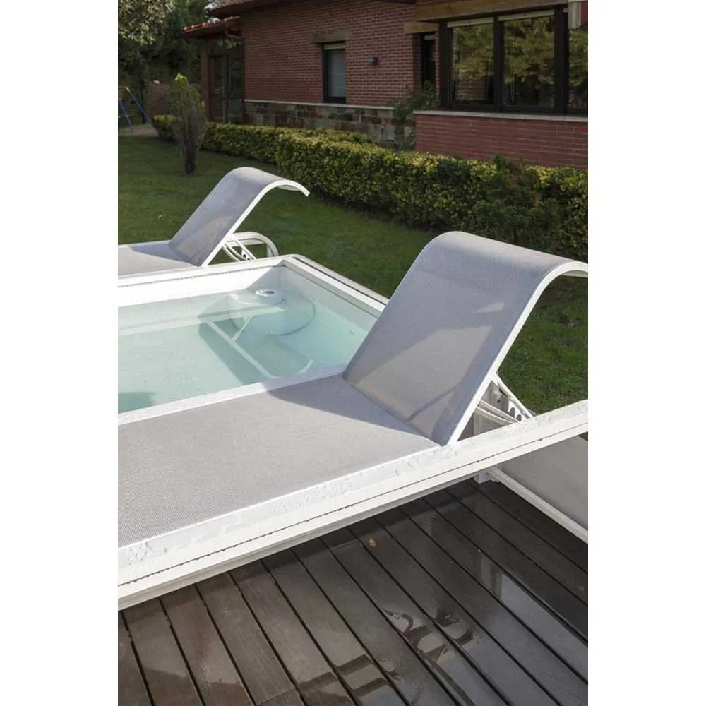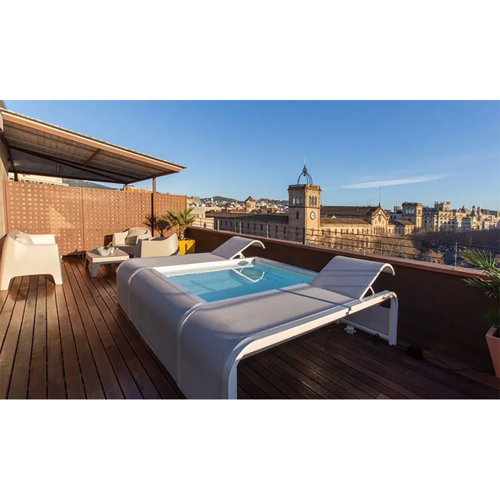 Mariposa is a small pool that simulates a fragile white butterfly which can be found on a surface or a terrace. It is easy to install and ready to use in less than an hour and without any type of construction. The wings of Mariposa are comfortable sun beds with adjustable low back support with different positions.