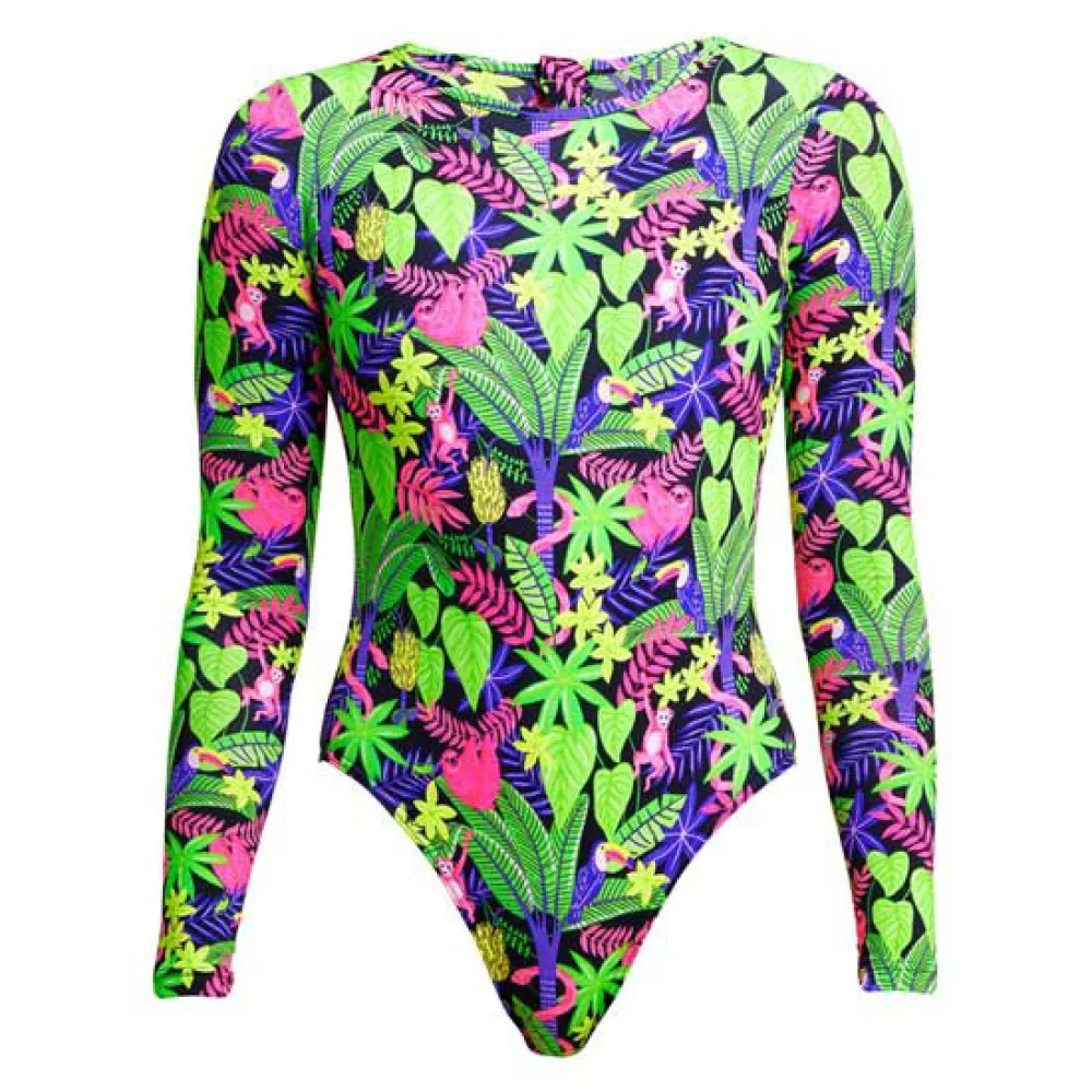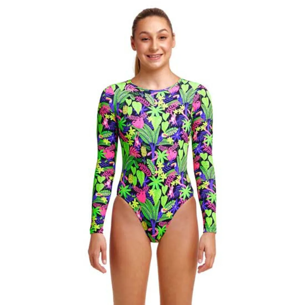 Full coverage for the girl who wants complete sun protection on their upper body with full arms, high back and high neck one piece.