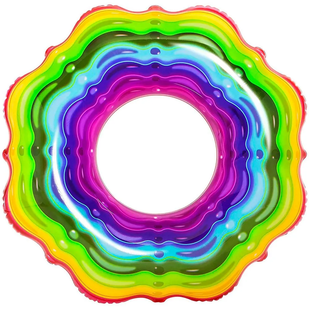 Circular float 115 cm in diameter that comes in a model with irregular edges decorated with the colors of the rainbow in fluorine finish.