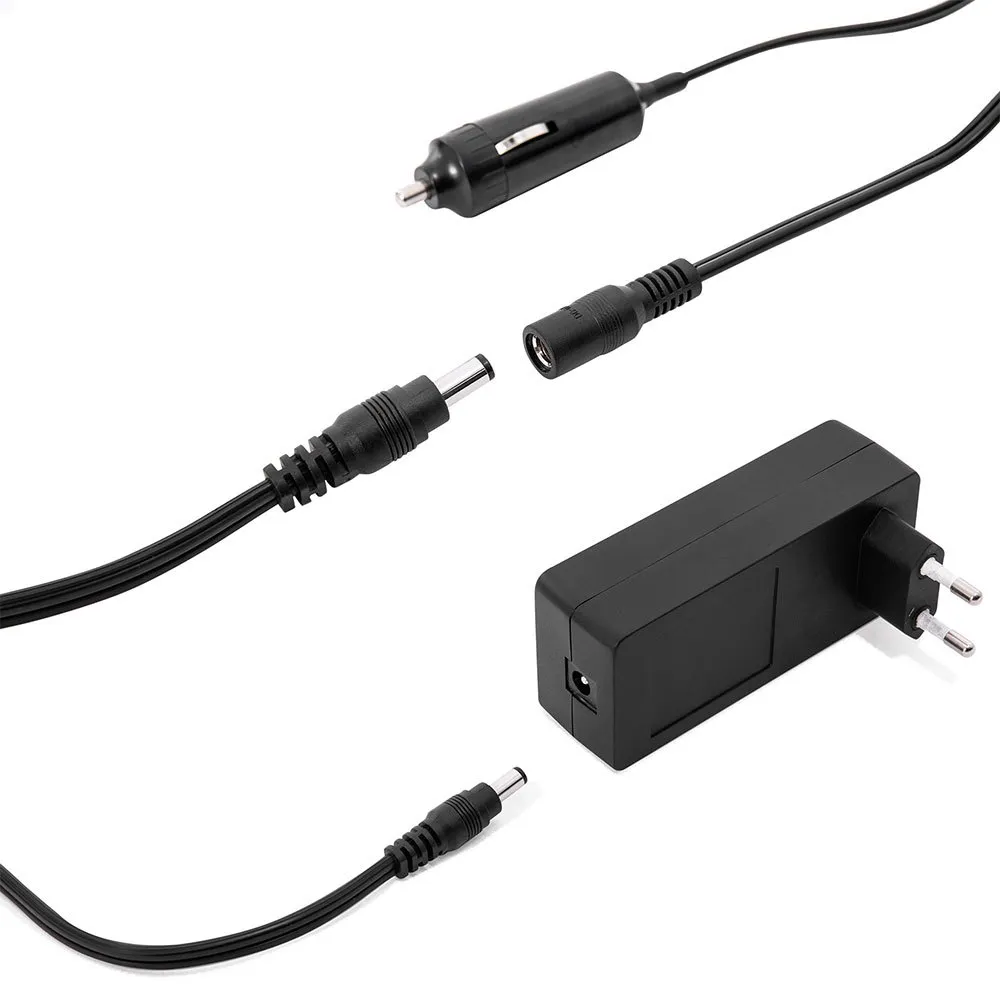 With 3 interchangeable adjustable nozzles (one needle) for any valve size, works with a 220-240v plug or car charger (both included)  .