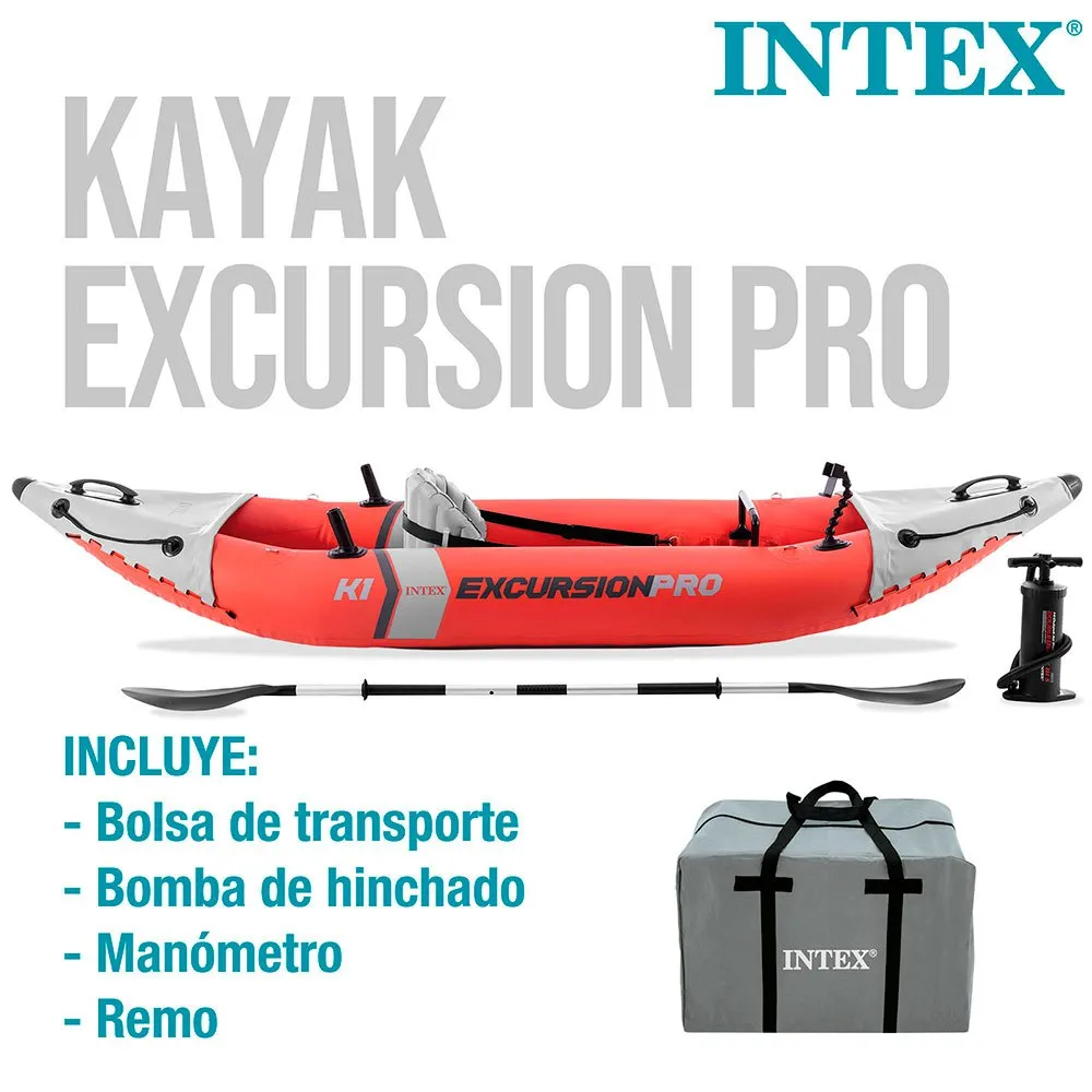 The INTEX K1 Excursion Pro inflatable kayak measures 305x91x46 cm, made of 0.75 mm 3-layer vinyl.