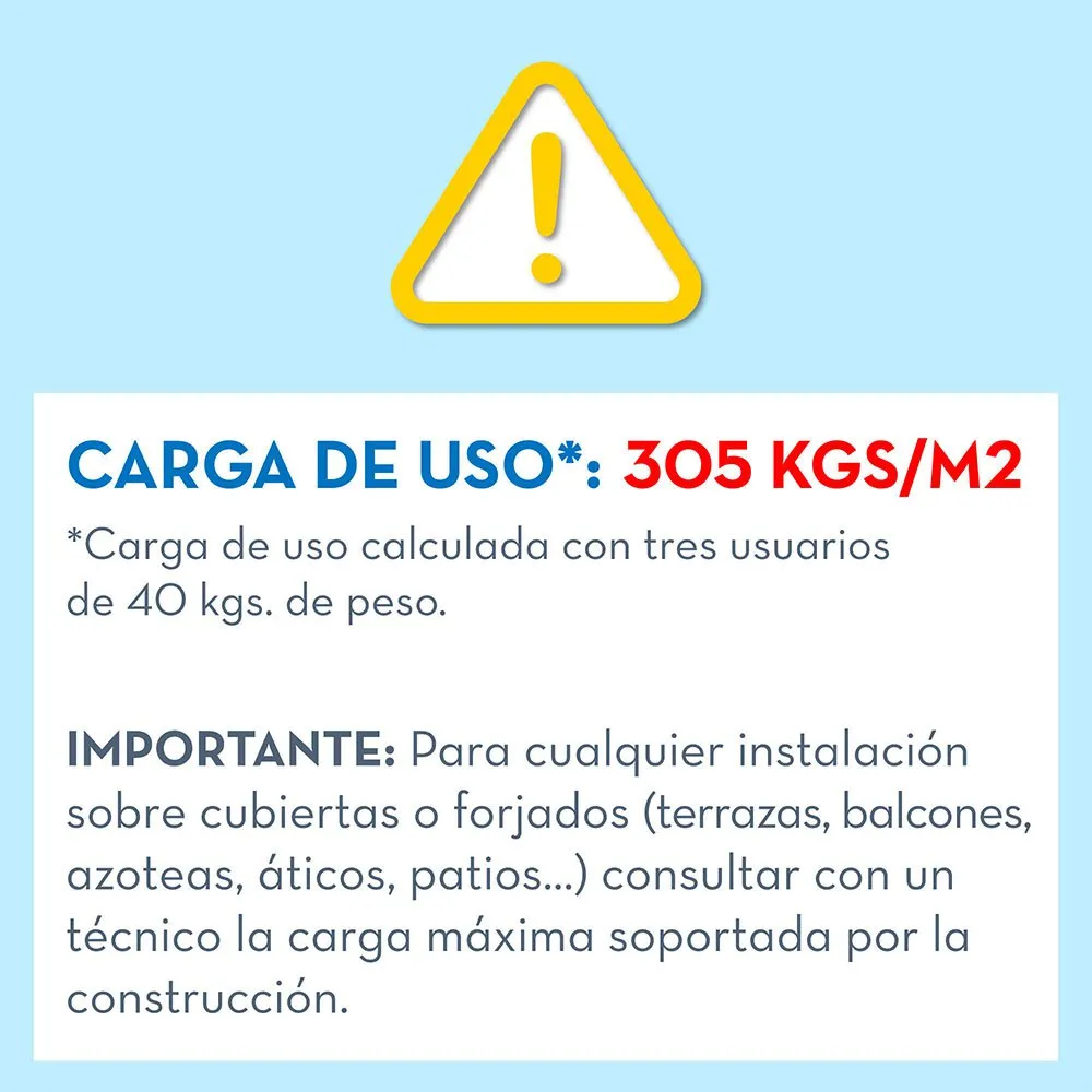 The inflatable pool holds a maximum weight of 81 Kg and has a maximum capacity of 493 litres of water (fill up to 20 cm high).