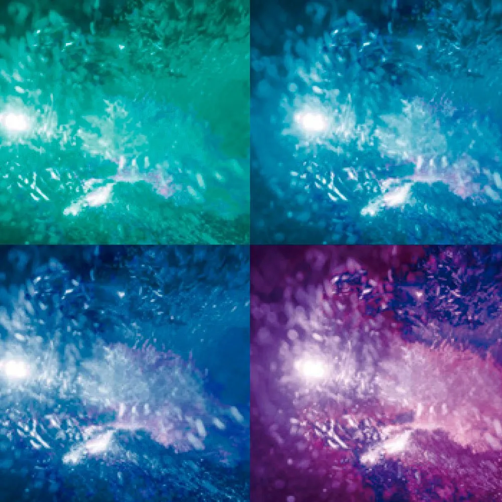 It has five different colours:white, green, aquamarine, blue and purple, and you can choose between a fixed colour or for it to change colour automatically.