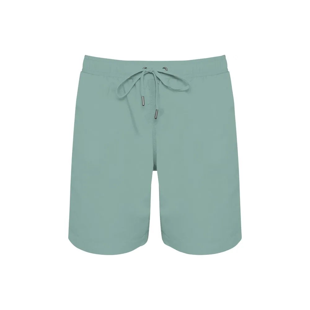 100% polyamide. Straight cut. 2 side pockets with mesh pocket bag. Point reinforcement at pockets, crotch, bottom of leg and back of waistband. Elasticated waistband with flat drawstring and metal tip. Mesh inner briefs with elasticated bias finish for comfort. Back welt pocket with zipper at nylon. Double needle at crotch and sides. No brand label on the waistband, only a size chip for easy customization.