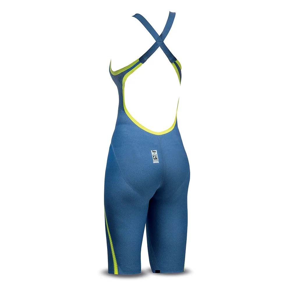 LIQUIDFIRE CORE The material is constructed on the basis of denim, which typically has a superficial diagonal pattern, made with the use of threads of different dimensions and structures. Once worn,it can stretch, creating a slightly undulating surface to follow water flow. This moulded surface has a separating effect between the viscosity of the water and the progress of the athlete, allowing a more natural movement and increasing lift. The helicoidal structure of the surface of the material and the cut of the costume without opposition points, or rather without closed rings of material around the body, allow the garment more stretch so that it remains adherent to the body without points of localized pressure. Furthermore, this construction leads to greater wearability,especially for women. As part of this research we have reduced pressure at the ends of the legs, still guaranteeing hold and avoiding uncomfortable constriction above the knee.