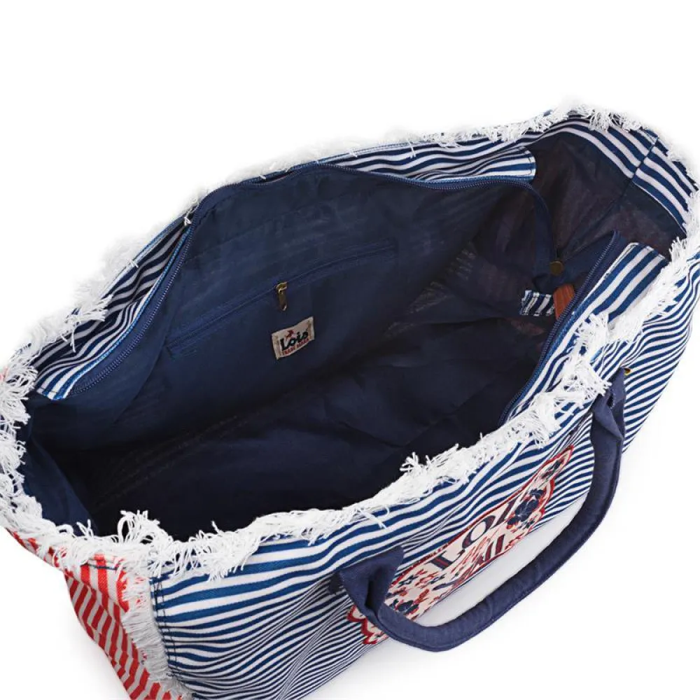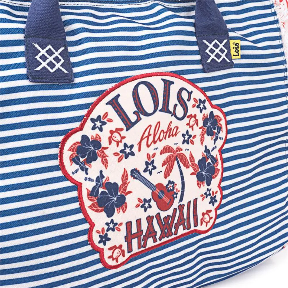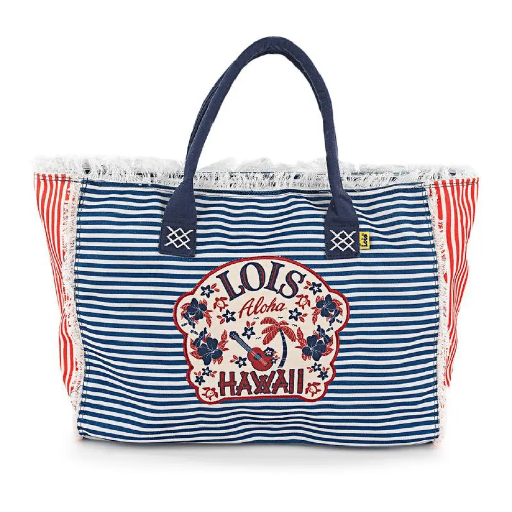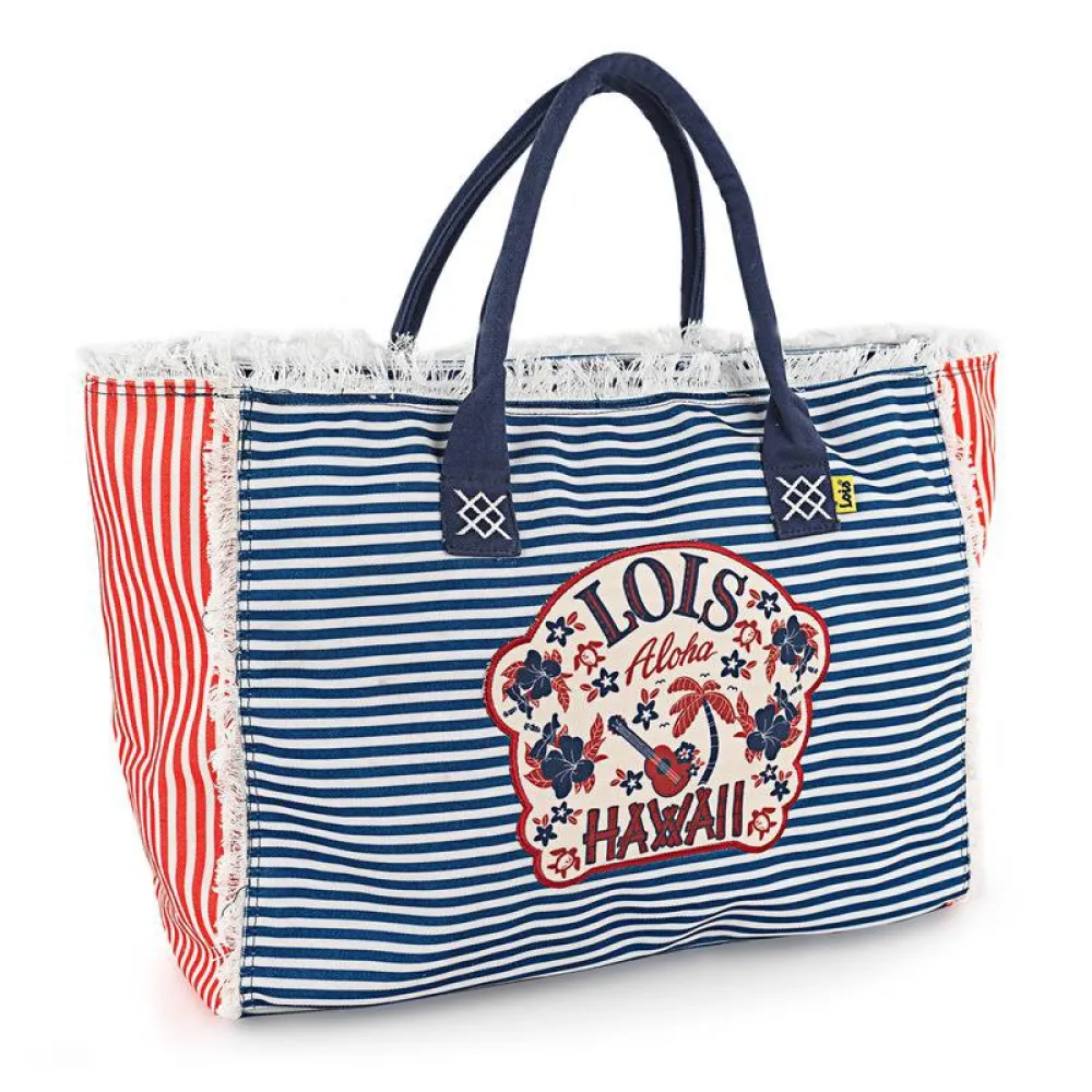 Womens T-shirt bag of the Lois brand. Original design unique and exclusive of the firm. For the manufacture of our resistant beach bags we use 100% cotton inside and 100% canvas for the outside. They can be closed with a zipper and are ideal for the beach, shopping, festivals, etc. They belong to the large formats and offer an incredible amount of storage space. They also have an interior zippered compartment. They belong to the large formats and offer an incredible amount of storage space. They also have an interior zippered compartment. Measures: 44x34x18 cm. Weight: 0.44 kg. Material: Polyester-Cotton.