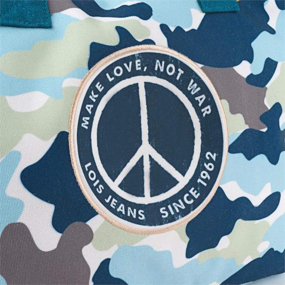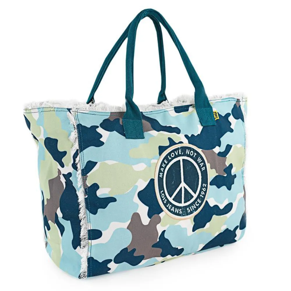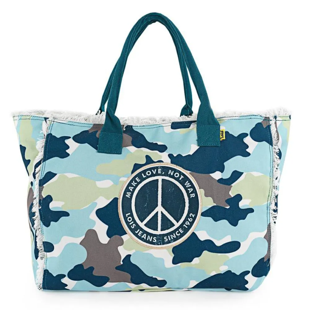 Womens T-shirt bag of the Lois brand. Original design unique and exclusive of the firm. For the manufacture of our resistant beach bags we use 100% cotton inside and 100% canvas for the outside. They can be closed with a zipper and are ideal for the beach, shopping, festivals, etc. They belong to the large formats and offer an incredible amount of storage space. They also have an interior zippered compartment. They belong to the large formats and offer an incredible amount of storage space. They also have an interior zippered compartment. Measures: 44x34x18 cm. Weight: 0.44 kg. Material: Polyester-Cotton.