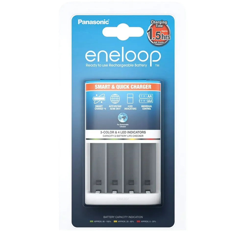 – The intelligent eneloop quick charger is ideal for the demanding user and charges 1-4 cells of size AA (Mignon) or AAA (Micro).
