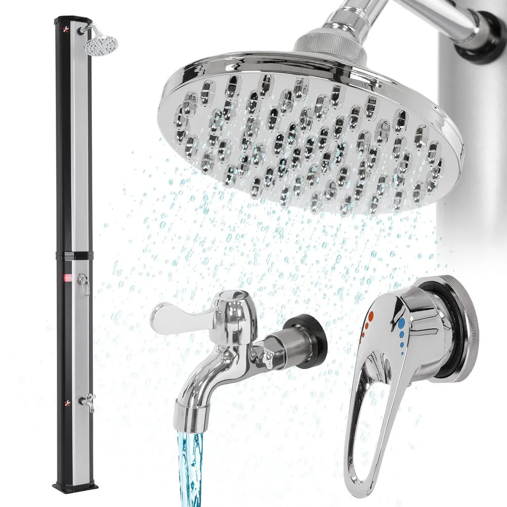 Que vous ayez besoin de vous rafraîchir après un bain de soleil ou que vous souhaitiez vous débarrasser de la sueur après avoir jardiné ou joué, le mitigeur assure une température parfaite en continu ! Un tuyau d´arrosage alimente la douche en eau fraîche et remplit le réservoir d´eau chaude de la douche. Celui-ci chauffe l´eau à 60°C maximum, en fonction de l´emplacement et de l´ensoleillement. Grâce au mitigeur monocommande en métal chromé, vous mélangez l´eau chaude du réservoir avec l´eau froide du tuyau d´arrosage pour obtenir la température souhaitée. La grande pomme de douche est orientable et s´adapte facilement à vos besoins. De plus, il y a un robinet pour une douche rapide au pied.