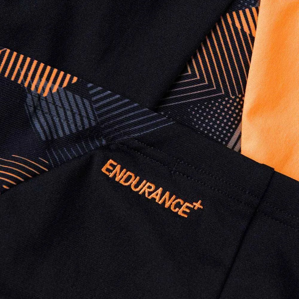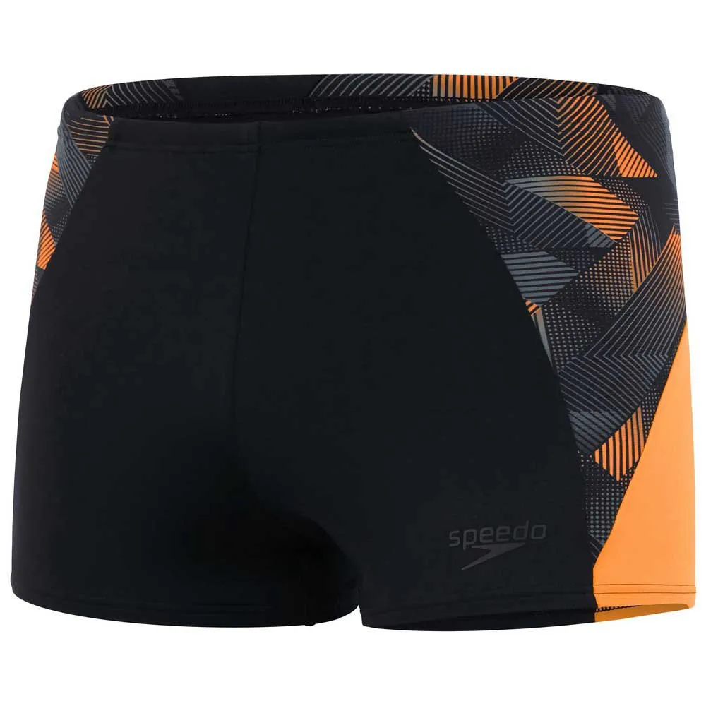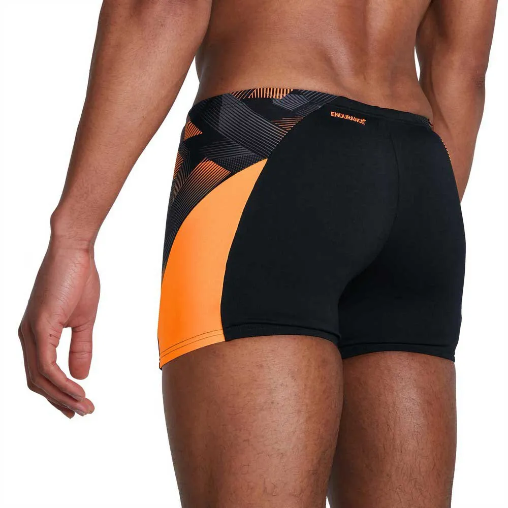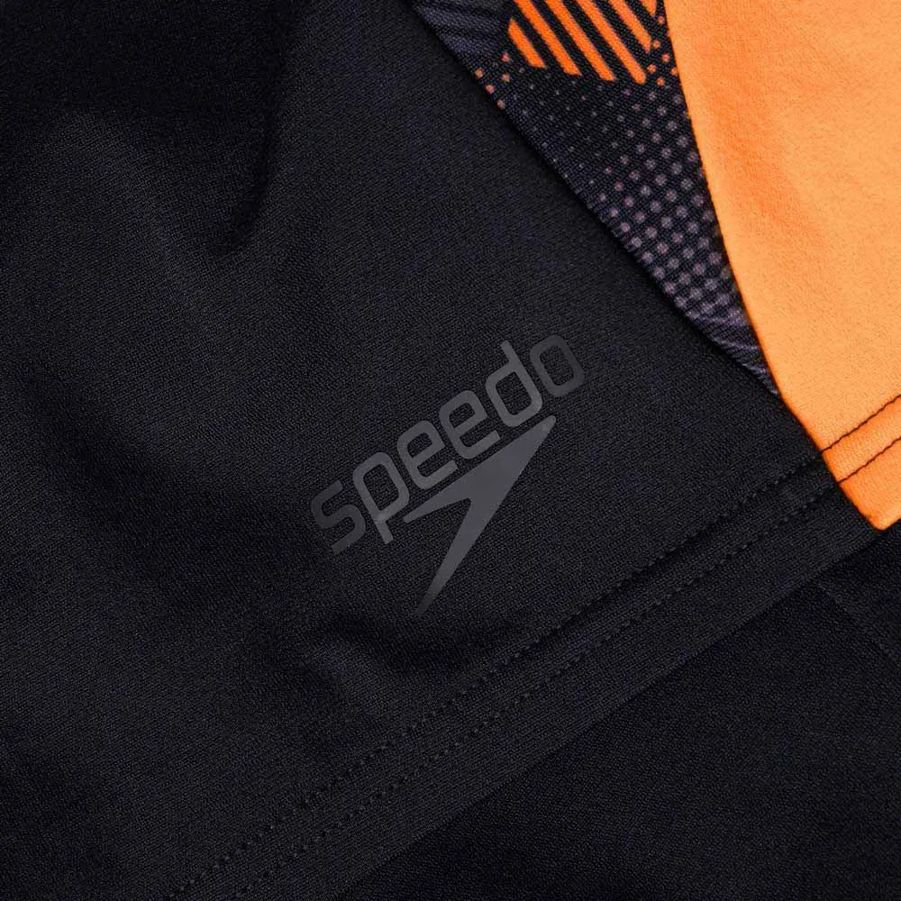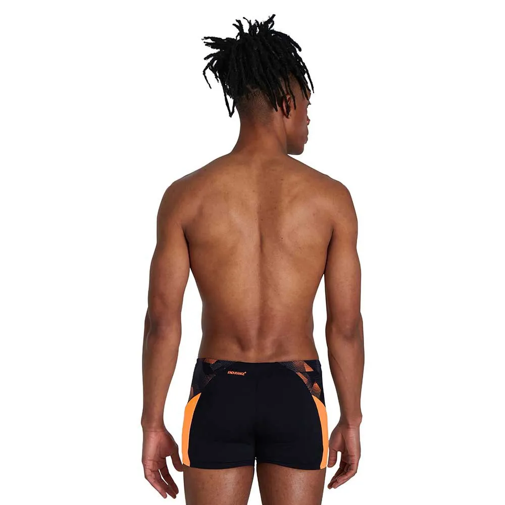Tech-inspired aesthetics. Cut a streamlined silhouette in training wearing this sleek Aquashort, designed with a contrasting orange side panel and spliced geometric print. A drawstring waist allows for an adjustable fit, so you feel comfortable and secure in the pool. Designed to be durable and better for the environment, it’s made from our new ECO Endurance+ fabric, which is 100% chlorine resistant, quick-drying and made from 50% recycled materials.