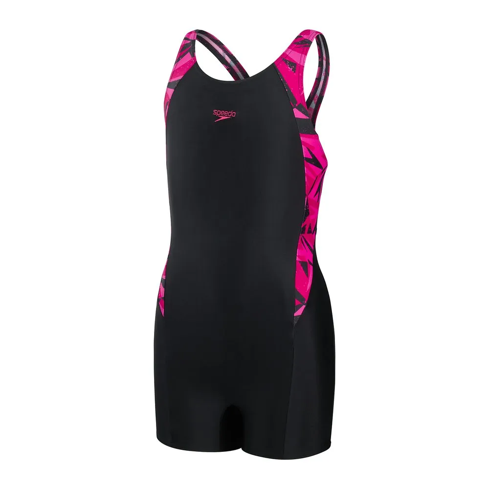 Style Speedo iconic. This sporty black legsuit has a sleek look and a curved border with our pink and black Boom logo . Ideal for longer swim sessions, the Legsuit´s muscleback style allows your child greater freedom of movement, while the Legsuit style offers maximum comfort. Quick-drying and stretchy, it´s made from our Endurance10 material that´s designed to keep its shape for a long time.