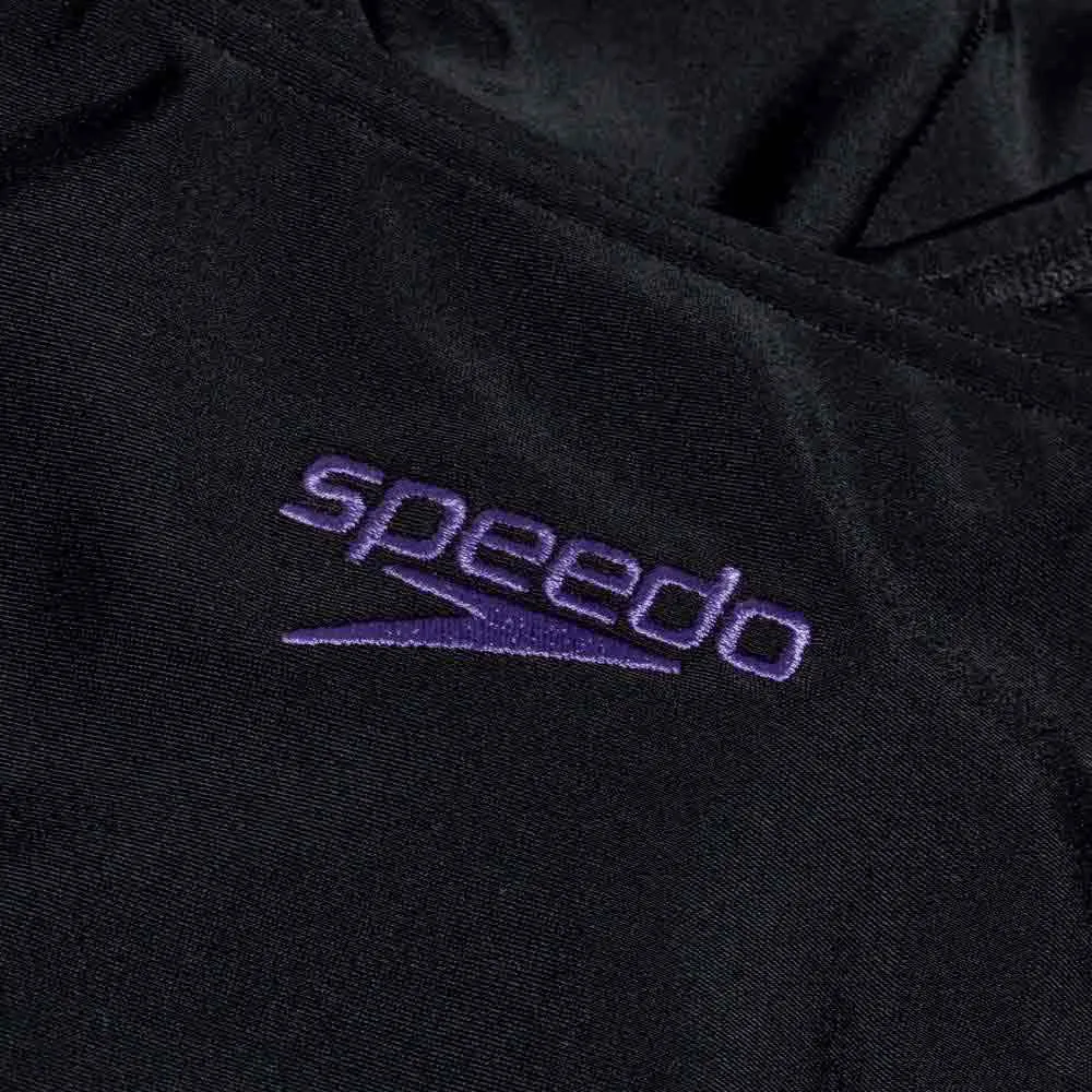 Iconic Speedo branding. Inspired by our heritage, this stylish black Racerback swimsuit features our famous Speedo Boom in an eye-catching lilac spray-paint effect design. Perfect for your workout, the racerback design includes wide straps which sit between your shoulder blades for comfort and flexibility. A comfortable bust shelf liner adds support. Providing higher chlorine resistance than standard swimwear fabrics, the swimsuit offers excellent shape retention and fits like new for longer with CREORA® HighClo. If you’re looking for great eco-credentials, it’s got those, too: our exclusive Eco EnduraFlex fabric is made from 100% recycled pre-consumer waste, such as recycled fabric waste from factories.