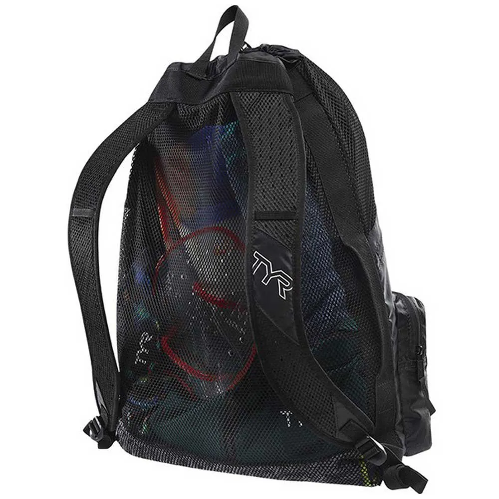 The tyr elite team mesh backpack is the perfect choice for hauling swim and workout gear. the lbmshlet features mesh venting for increased dry time and drainage. the adjustable, ventilated padded should straps allow for easy transport and versatile carrying options. includes large secondary compartment and gear loops for additional storage.